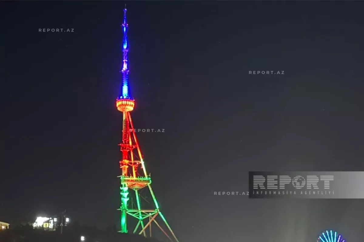 Тбилисская телебашня подсвечена в цветах Государственного флага Азербайджана.