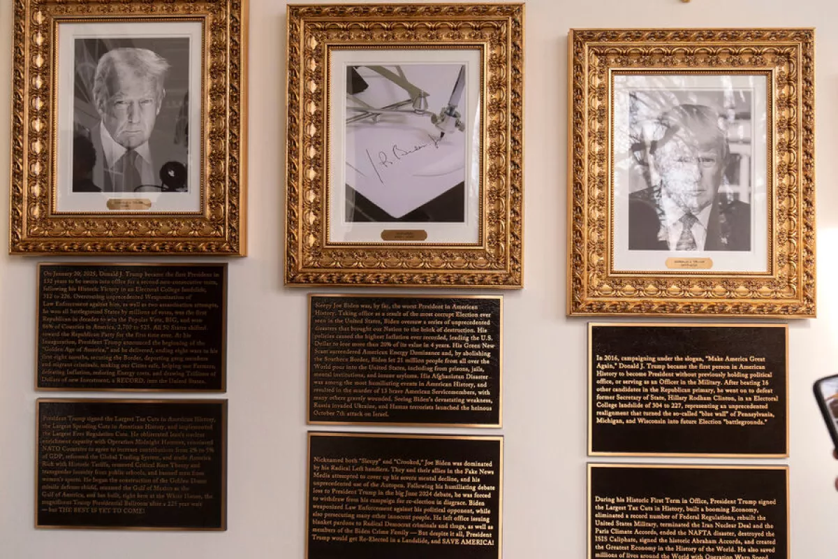 По портретом Барака Обамы указано, что он был «одной из самых спорных политических фигур в американской истории». На памятной табличке, посвященной Биллу Клинтону, упоминается, что Трамп победил его жену Хилари Клинтон на выборах в 2016 году.