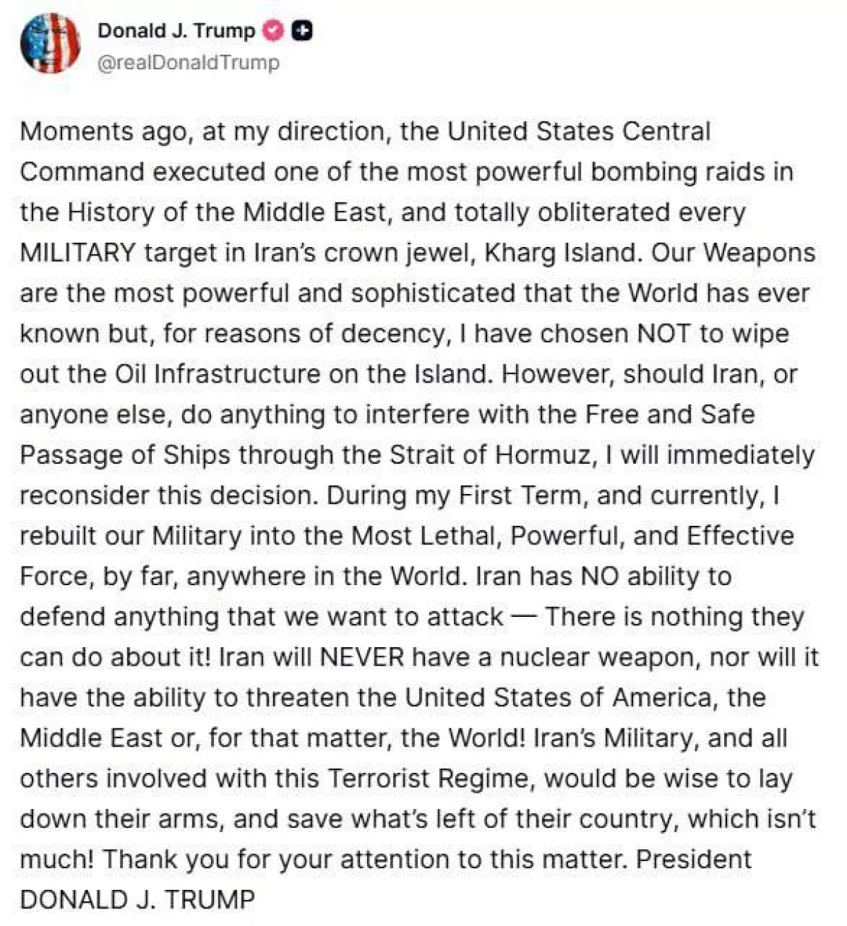 «Несколько минут назад, по моему указанию, Центральное командование США провело один из самых мощных бомбовых ударов в истории Ближнего Востока и полностью уничтожило все ВОЕННЫЕ цели Ирана на его «жемчужине» — острове Харк. Наше оружие — самое мощное и самое совершенное из всех, что когда-либо знал мир, но по соображениям приличия я решил НЕ уничтожать нефтяную инфраструктуру на острове. Однако если Иран или кто-либо еще попытается помешать свободному и безопасному проходу судов через Ормузский пролив, я немедленно пересмотрю это решение», — заявил президент США.