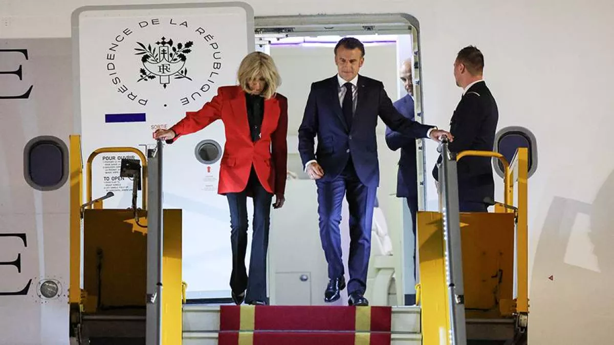 В мае 2025 года американское агентство Associated Press распространило видео прилета президента Франции во Вьетнам. На кадрах виден силуэт Макрона, все еще находящегося внутри самолета, в этот момент появляются руки его жены, хотя ее самой полностью не видно, она быстро подняла руку к лицу мужа, будто дав пощечину.
