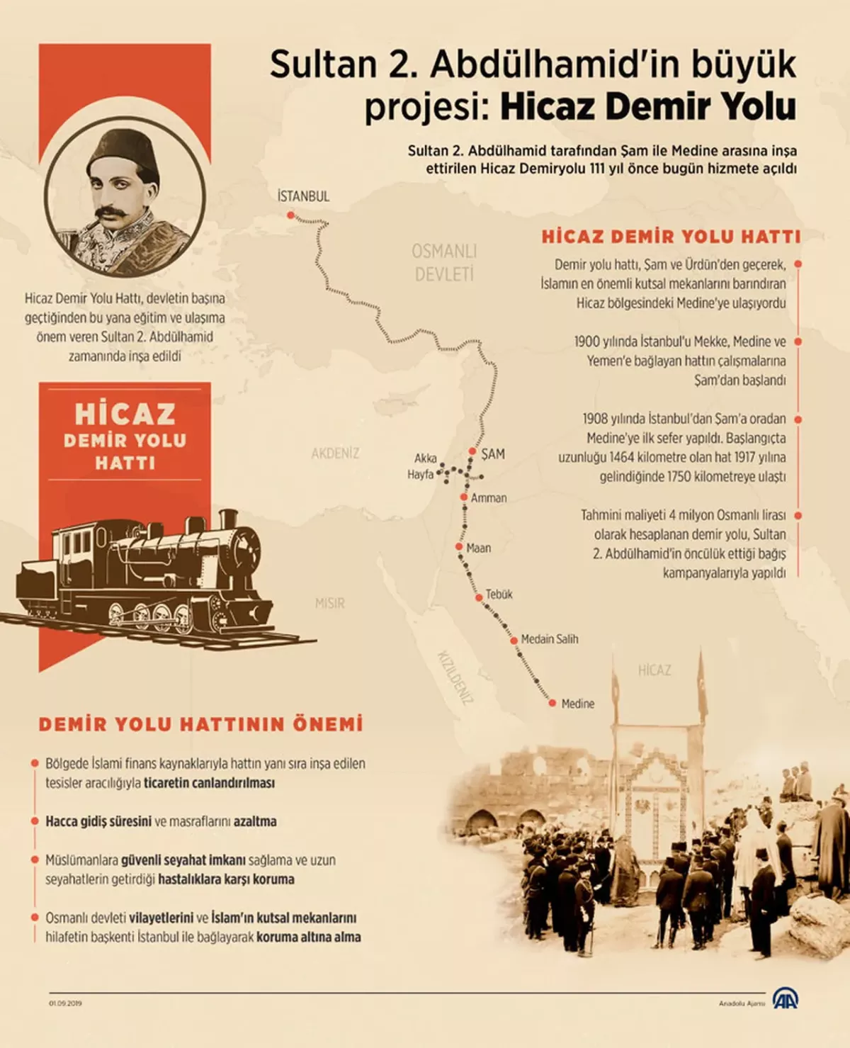 Железная дорога от Дамаска до Медины протяженностью 1 тыс. 322 километра была построена в 1900-1908 гг. в период правления султана Абдул-Хамида II. Одной из целей было объединение единой железнодорожной сетью столицы Стамбула со священными для мусульман землями. После Первой мировой войны дорога была разделена на несколько участков и впоследствии утратила значимость.