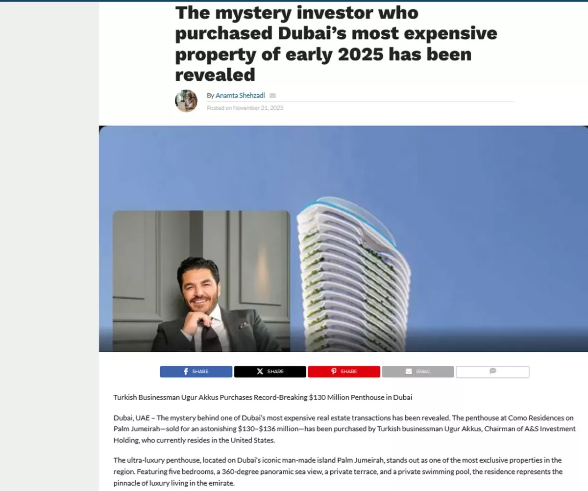 Сделка, которая в июне вызвала бурную реакцию в международных СМИ под заголовком «Турок купил самый дорогой дом в Дубае», предположительно была организована Угуром Аккушем, турецким бизнесменом, проживающим в США, и председателем совета директоров инвестиционного холдинга A&S.