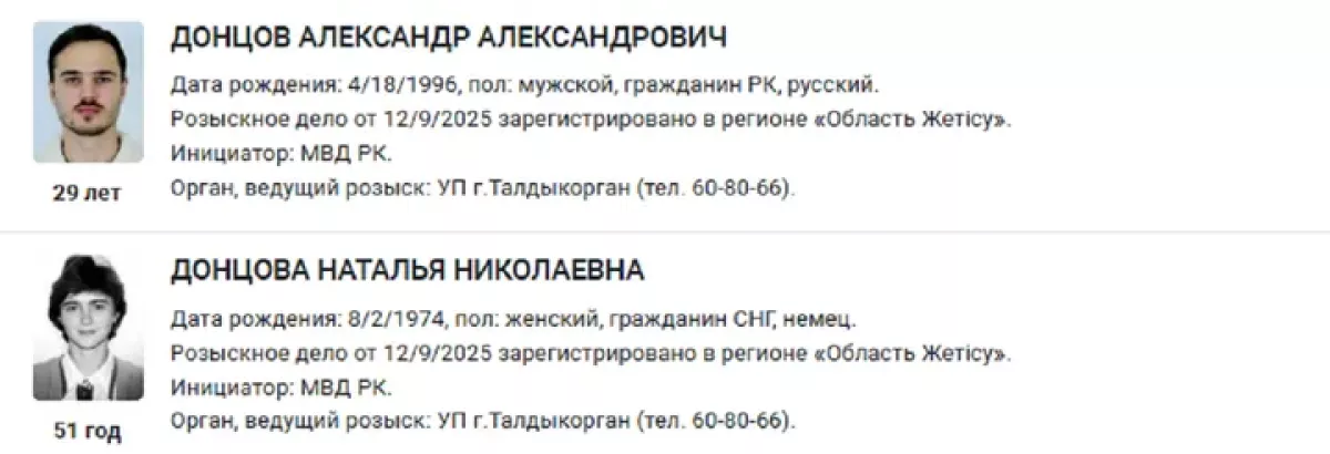 Инициатором розыска выступило МВД Казахстана. При этом дело ведут сотрудники полиции Талдыкоргана в области Жетысу. Так, в розыск был объявлен супруг погибшей Александр Донцов, а также его мать и свекровь Сайлыбаевой — Наталья Донцова.