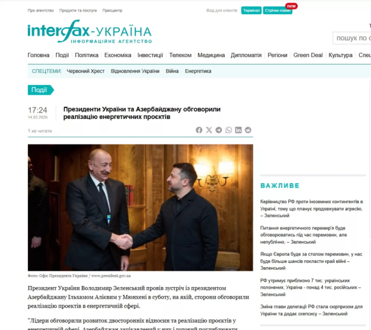 Как сообщает АЗЕРТАДЖ, в публикациях государственного информационного агентства «Укринформ», а также агентств и новостных порталов «Интерфакс-Украина», «РБК-Украина», «УНИАН», «Цензор», «Гордон», «Украинская правда», «24tv.ua», «Корреспондент» и другими, нашли отражение высказывания Президента Ильхама Алиева о парафированном мирном соглашении между Азербайджаном и Арменией, атаках со стороны России на энергетическую инфраструктуру и посольство Азербайджана в Украине, а также информация о встрече президентов Азербайджана и Украины.
