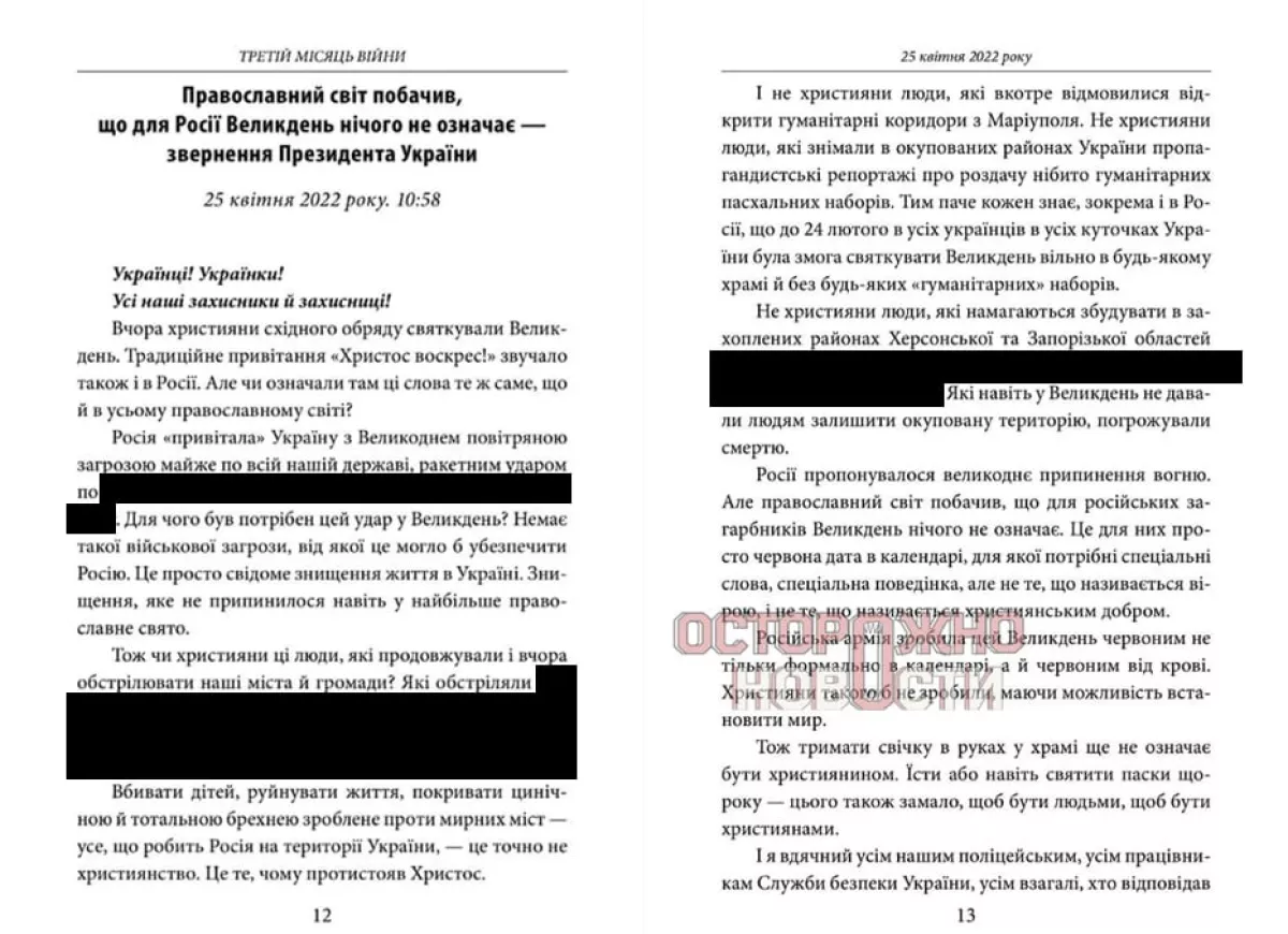 Согласно информации, книгу украинского издательства «Фолио» с расшифровкой выступлений Владимира Зеленского и хроникой боевых действий весной 2022 года представители прокуратуры нашли ещё год назад и отдали на экспертизу.