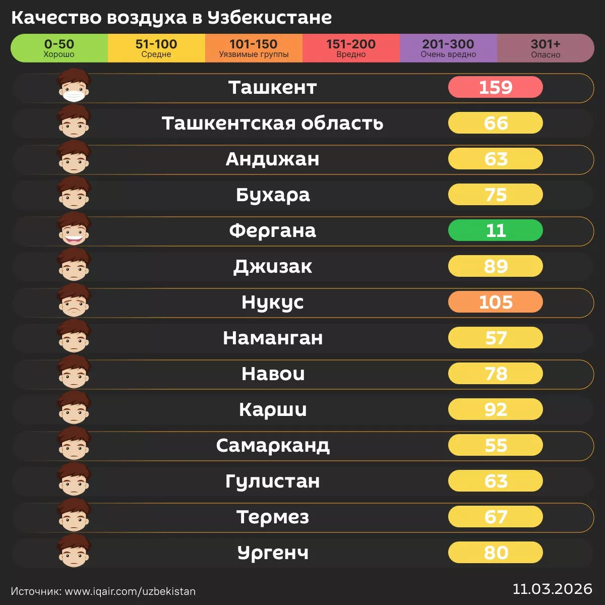 Воздух в Ташкенте сегодня утром вредный.