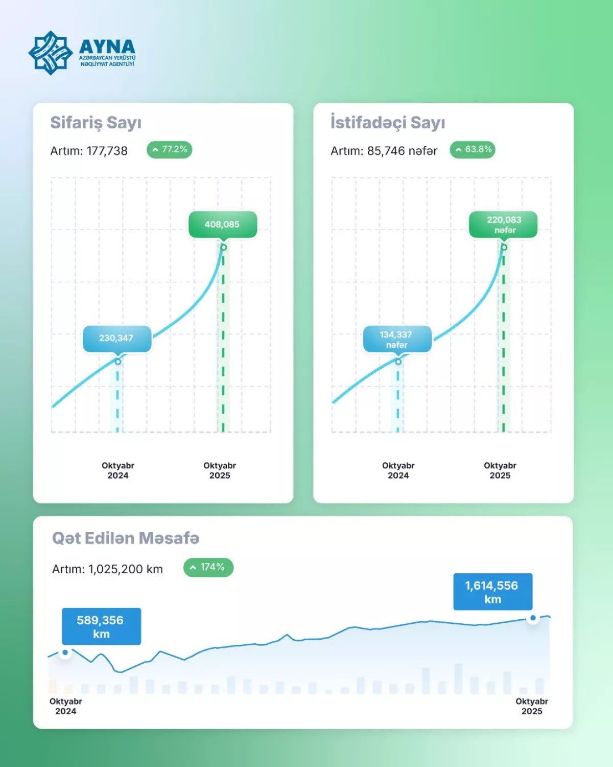 Как сообщили Caliber.Az в пресс-службе AYNA, в частности, количество заказов поездок за указанный период выросло на 77,2% (177 738) - с 230 347 до 408 085.