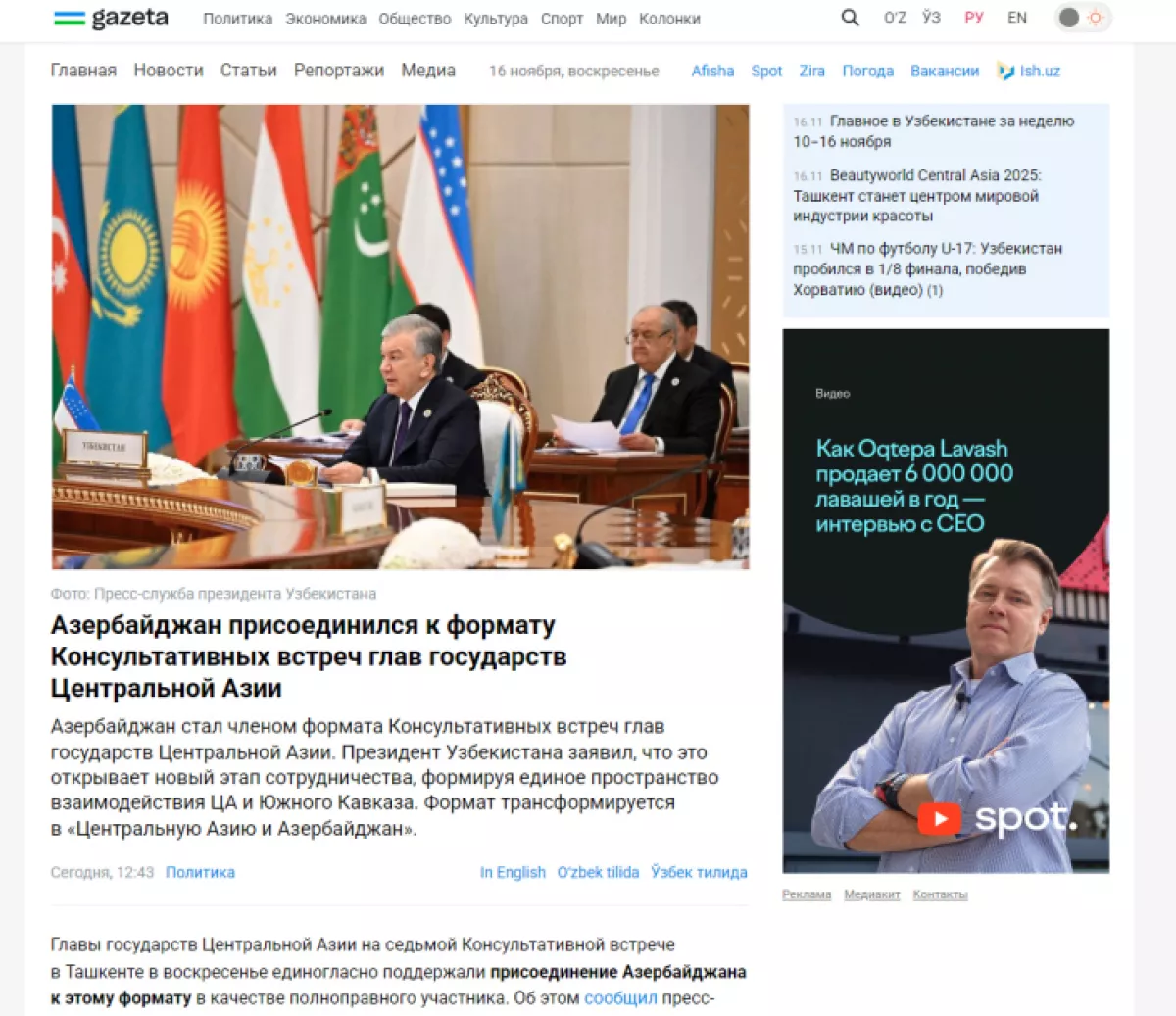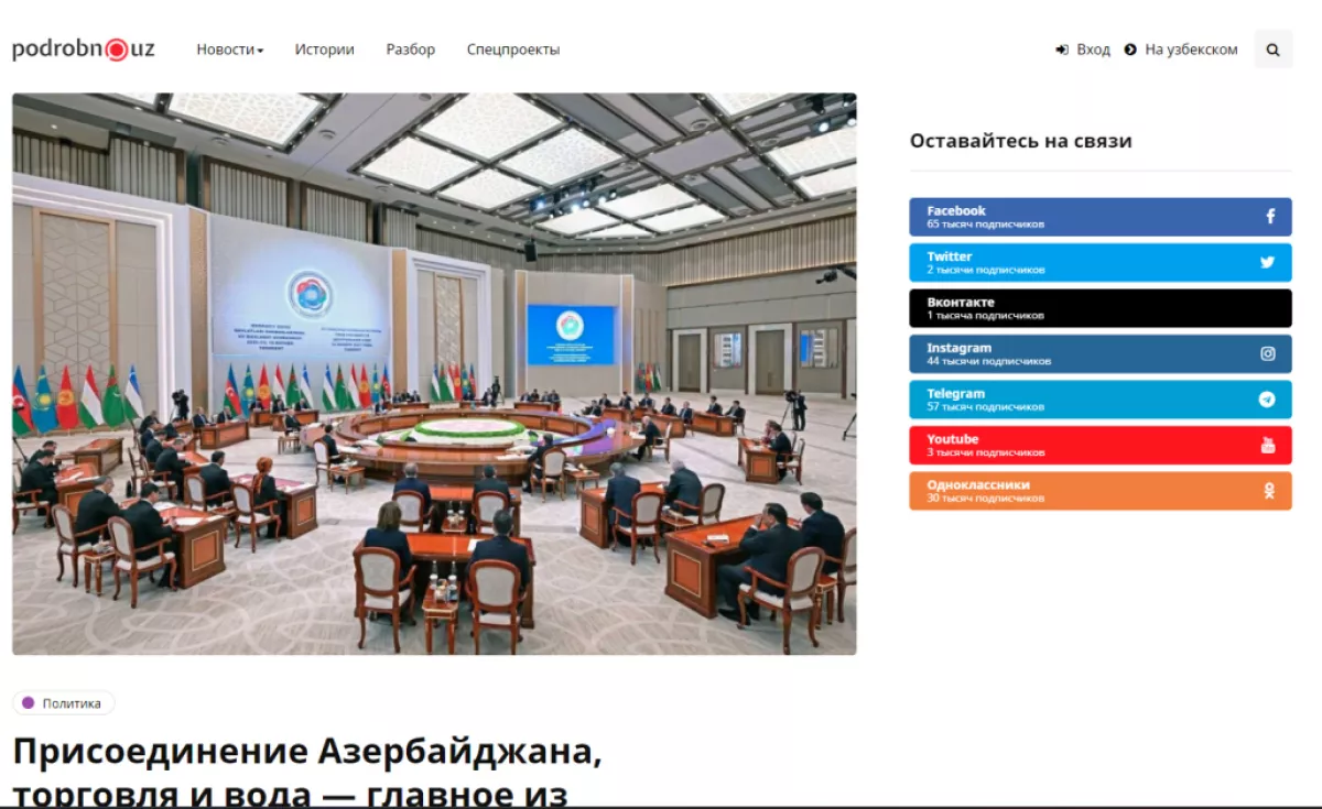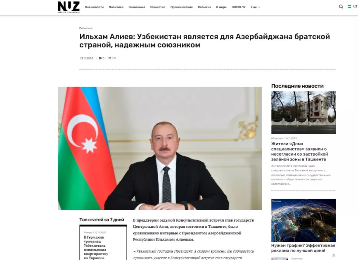 Сайт Nuz.uz вынес в заголовок слова Президента Ильхама Алиева: «Узбекистан является для Азербайджана братской страной и надежным союзником» и пишет, что Центральная Азия и Азербайджан формируют единое культурное, географическое и геополитическое пространство. В материале снова приводится цитата Президента Ильхама Алиева и доводится до внимания, что на самом деле Каспийское море не разделяет Азербайджан и Центральную Азию, а наоборот — объединяет.