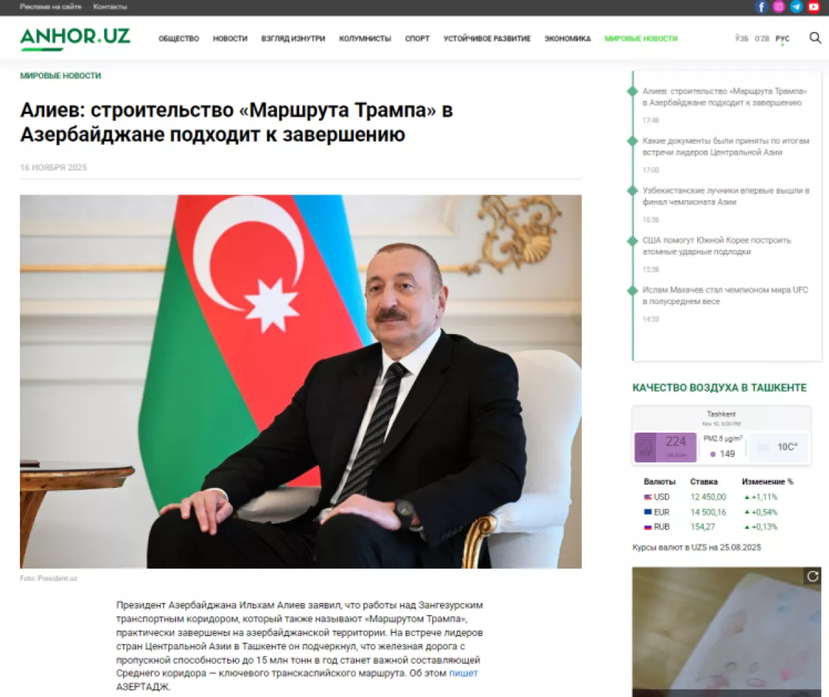 В материале, опубликованном на сайте Anhor.uz, приводится цитата из выступления Президента Ильхама Алиева: «Убежден, что достигнутые в августе этого года в Вашингтоне договоренности по соединению основной части Азербайджана с его Нахчыванской Автономной Республикой будут содействовать расширению транзитных возможностей для международных перевозок. Строительство Зангезурского коридора на территории Азербайджана близится к завершению», и отмечается, что запуск «маршрута Трампа», принесет пользу не только Азербайджану, но и центральноазиатским республикам, откроет большие возможности для расширения торговых связей.