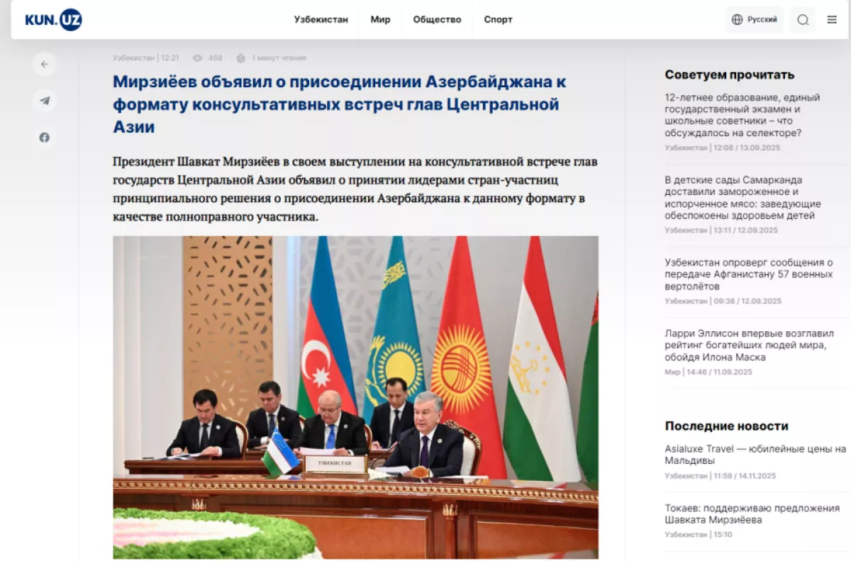 В материале на сайте KUN.uz доводится до сведения, что, хотя Азербайджан географически относится к Южному Кавказу, его активное сотрудничество с Центральной Азией привело к формированию единого геополитического и геоэкономического пространства.