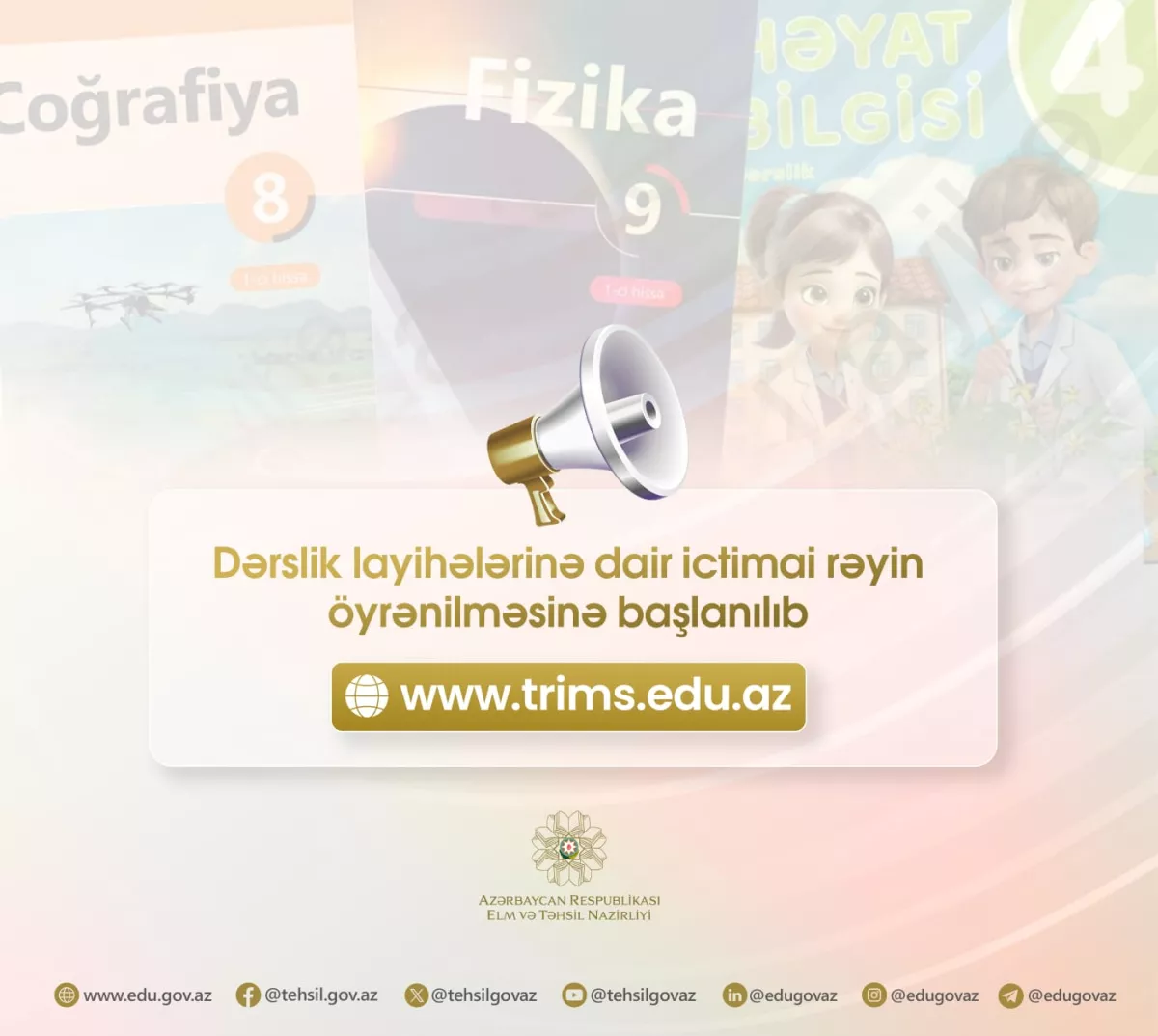 Одновременно с этим, можно отправлять мнения и предложения по электронной почте на адрес derslik@edu.gov.az.
