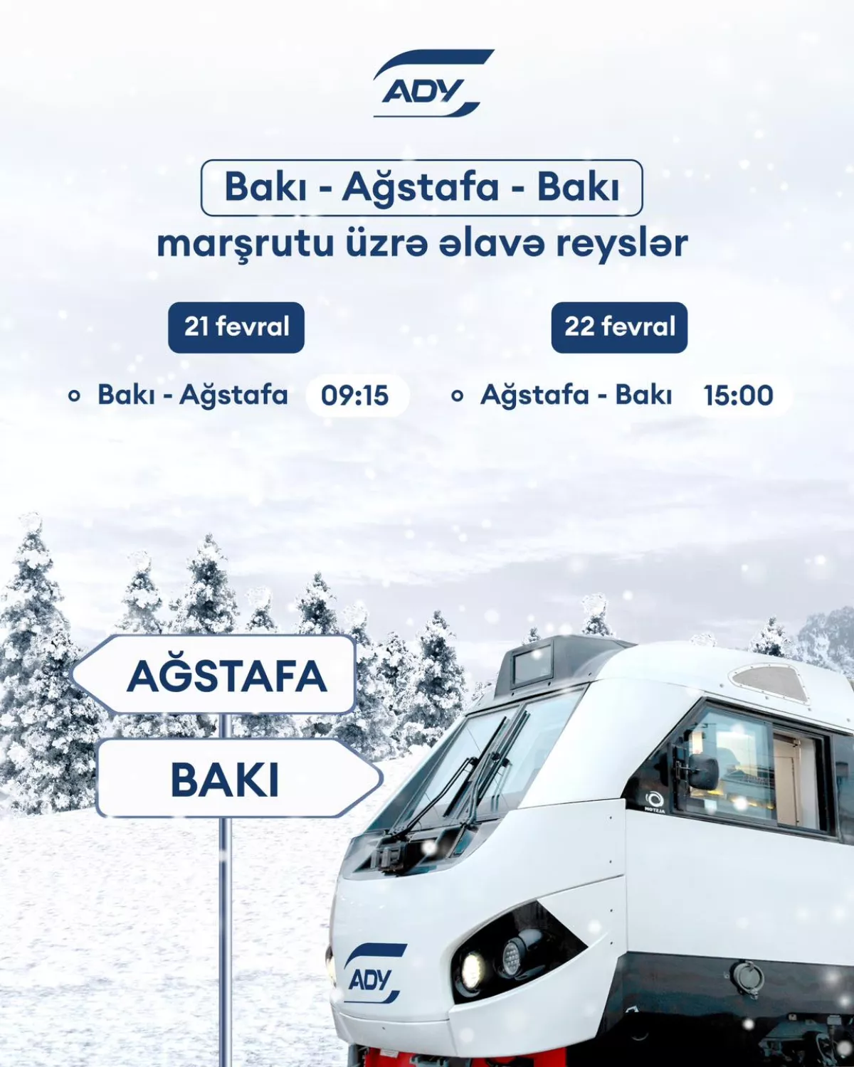 ЗАО «Азербайджанские железные дороги» (АЖД) с целью удовлетворения растущего пассажирского спроса назначило дополнительные рейсы по маршрутам Баку-Агстафа на субботу, 21 февраля (в 09:15) и Агстафа-Баку – на воскресенье, 22 февраля (в 15:00).