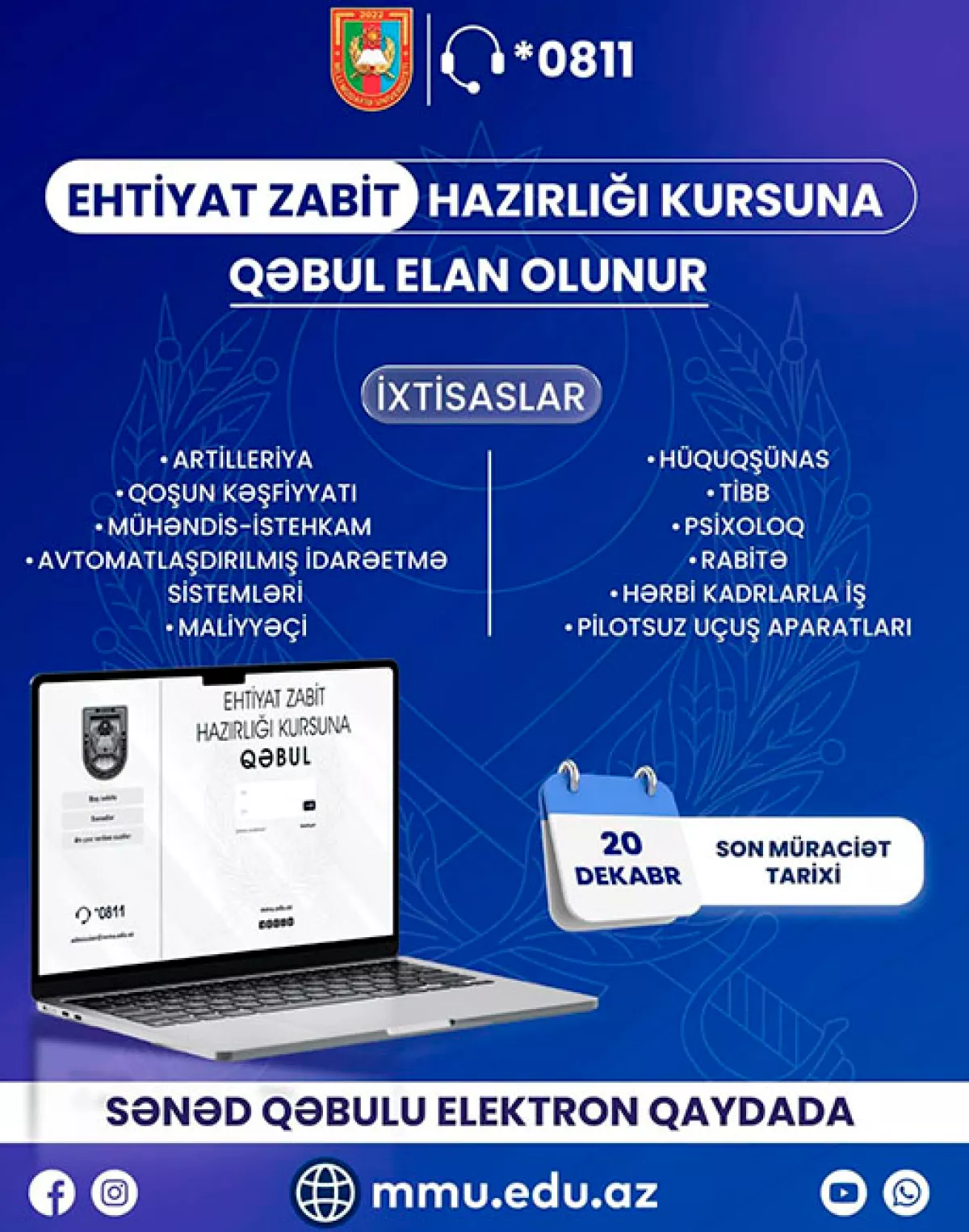 Как сообщили Caliber.Az в Минобороны, документы принимаются до 20 декабря. На курс подготовки офицеров запаса приглашаются граждане Азербайджанской Республики мужского пола в возрасте до 35 лет, имеющие высшее образование и прошедшие срочную действительную военную службу.