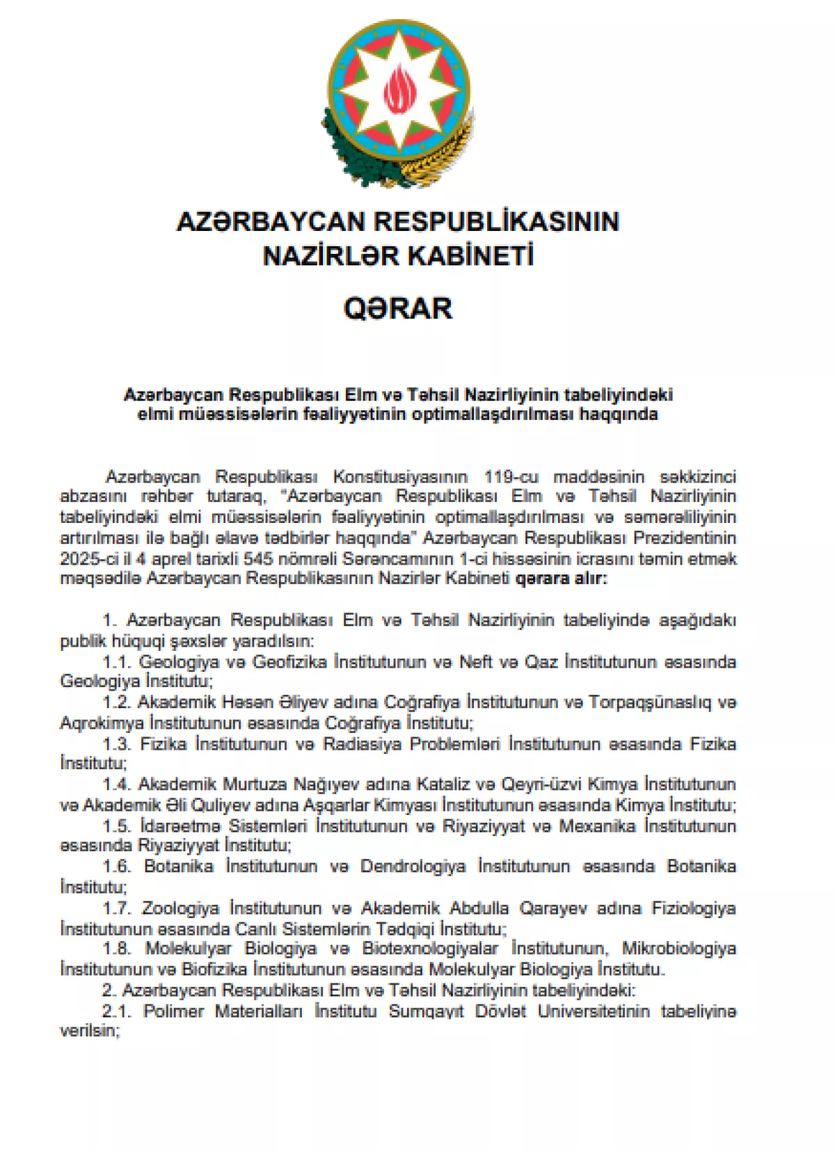 В Азербайджане оптимизирована деятельность научных учреждений, подведомственных Министерству науки и образования.
