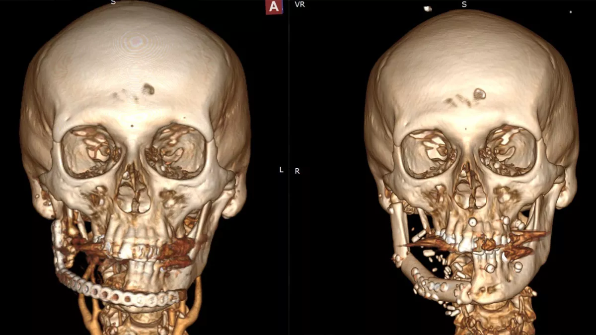 Полтора года назад пациенту из-за широко распространённого злокачественного образования в области головы и шеи была удалена половина нижней челюсти, на место которой была установлена титановая конструкция. В ходе последней операции, выполненной с применением современных медицинских технологий, ранее установленная титановая пластина была удалена, а половина нижней челюсти восстановлена с использованием собственной кости пациента — малоберцовой кости (fibula).