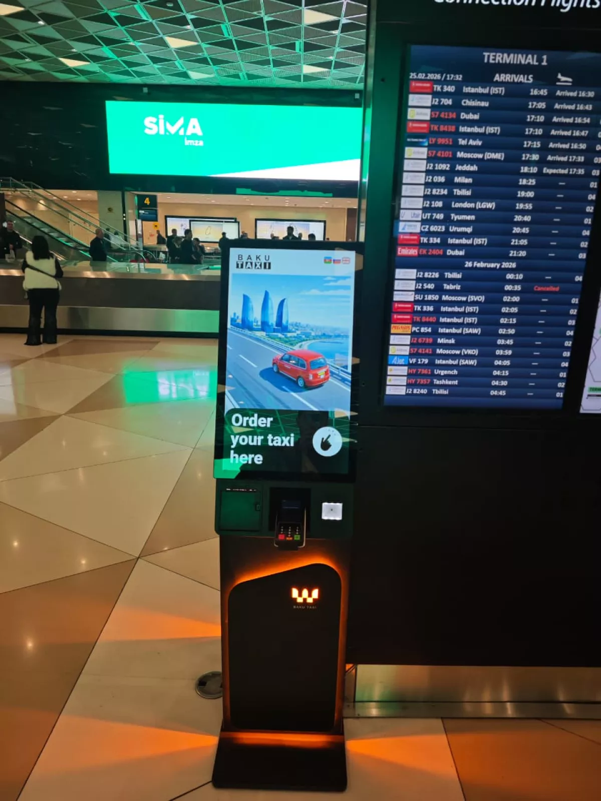 Через эти терминалы пассажиры могут заказать автомобили «Баку Такси», ожидая свой багаж. При заказе есть возможность оплаты как наличными, так и банковскими картами.
