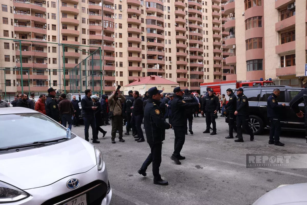 Сотрудники МЧС эвакуируют жителей жилого здания на проспекте Ходжалы, где произошел пожар.