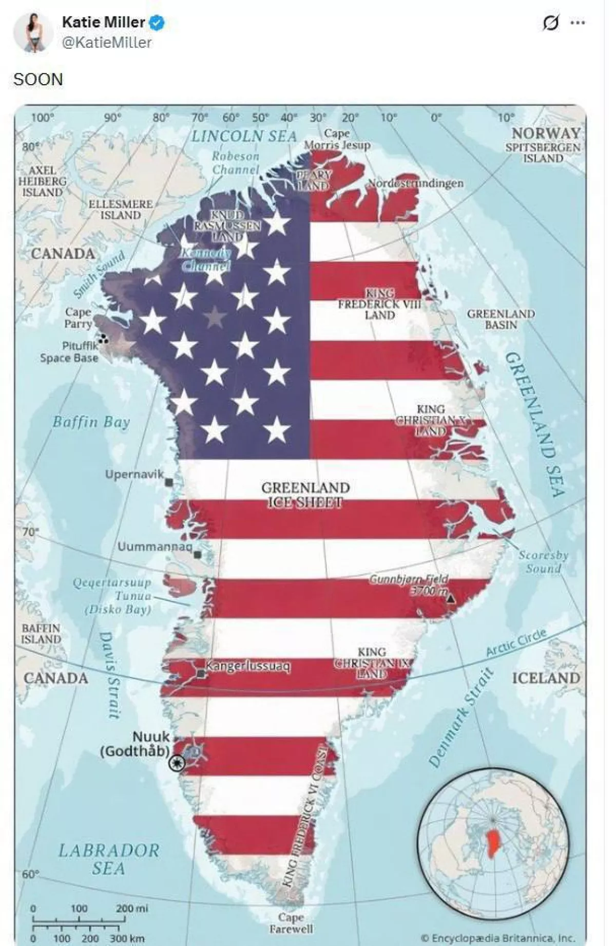 Супруга заместителя главы администрации Белого дома Кэти Миллер опубликовала в соцсетях изображение карты Гренландии с наложенным на неё государственным флагом США.