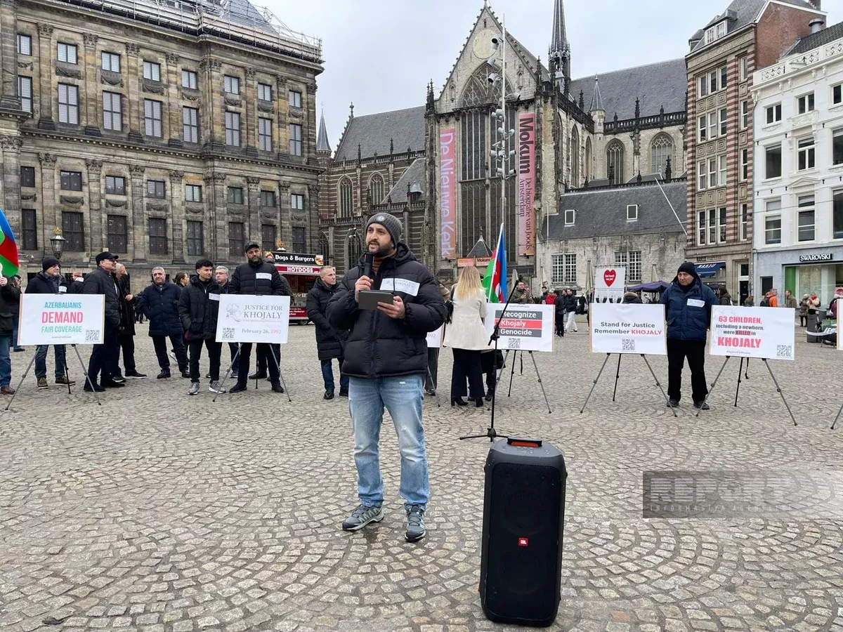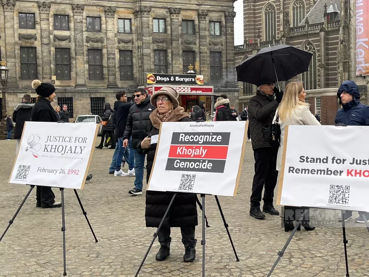 Проживающий в Нидерландах Джавидан Мамедов рассказал проявившим интерес к акции жителям города о Ходжалинском геноциде. Участники акции развернули флаги Азербайджана, а также установили на площади плакаты с требованиями справедливости для невинных погибших и пострадавших в ту страшную февральскую ночь. Они скандировали лозунги «Справедливость для Ходжалы», «Нет геноциду», «Человечество против геноцида», «Во имя мира».