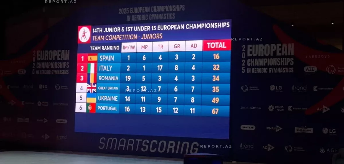 Как сообщает Report, в рамках соревнований, проходящих в Гянджинском дворце спорта, в молодежной возрастной категории среди команд золото взял коллектив из Испании, второе место досталось Италии, третье - Румынии.