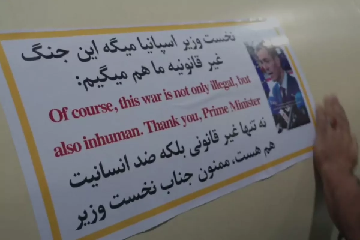 Как сообщает El Mundo, на наклейках размещена надпись на английском и фарси с фразой, произнесённой Санчесом на саммите ЕС в Брюсселе: «Конечно, эта война не только незаконна, но и бесчеловечна». Также добавлена надпись: «Спасибо, господин премьер».
