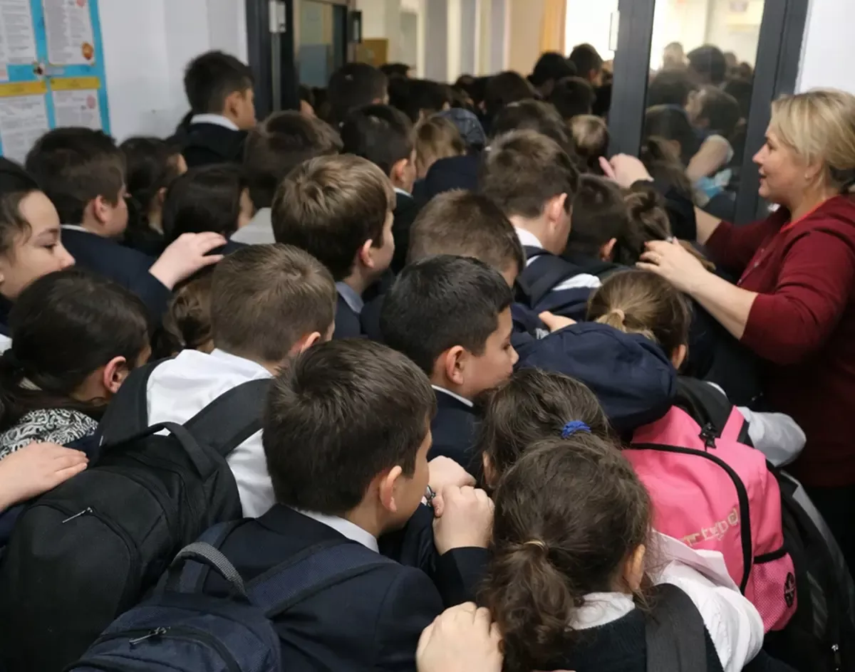 По данным ведомства, затор в коридоре образовался после завершения шестого урока у второй смены, когда школьники массово направились в гардероб. Временное скопление людей продолжалось около трех минут.