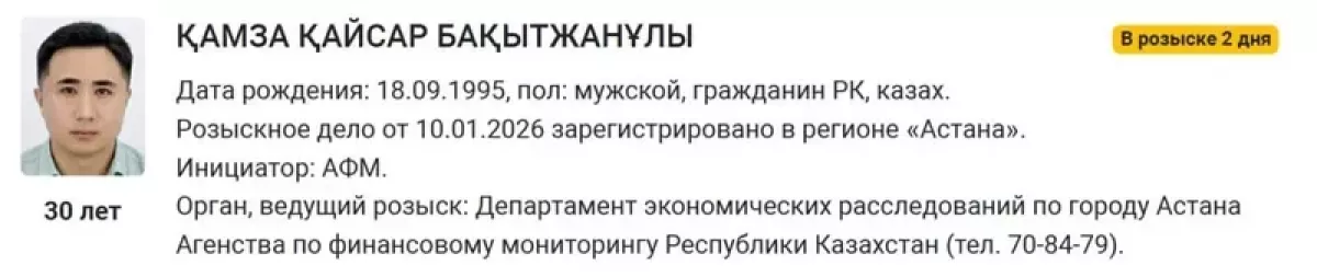 Инициатором розыска указано Агентство по финансовому мониторингу Казахстана. Розыскное дело зарегистрировано 10 января в Астане.