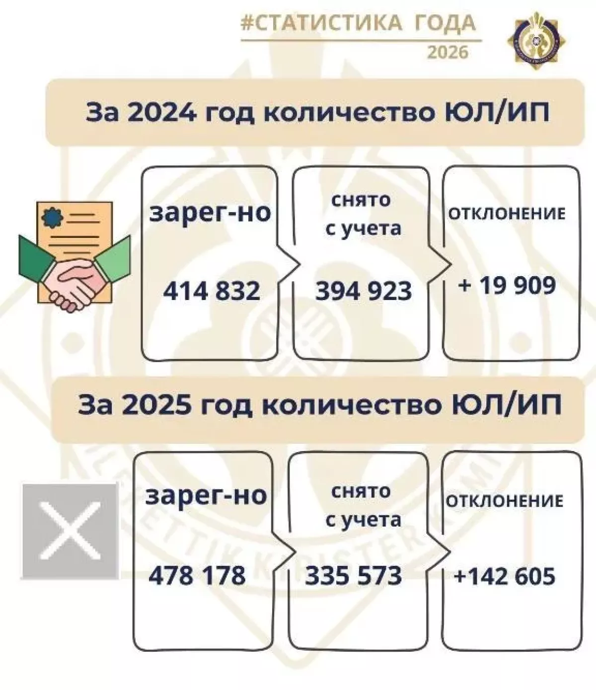 «В 2025 году также наблюдается положительная динамика предпринимательской активности. Количество зарегистрированных ЮЛ и ИП достигло 478 тыс., что превышает показатели предыдущего года. Одновременно с учета снято 335 тыс. субъектов. В результате чистый прирост за 2025 год составил 142 тыс. ЮЛ и ИП», сообщает пресс-служба КГД.