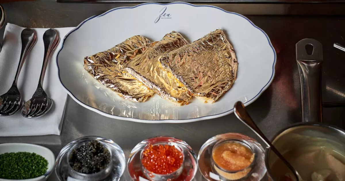 Ресторан Zea в Москве представил новую позицию в меню — блины, покрытые 23‑каратным золотом.
