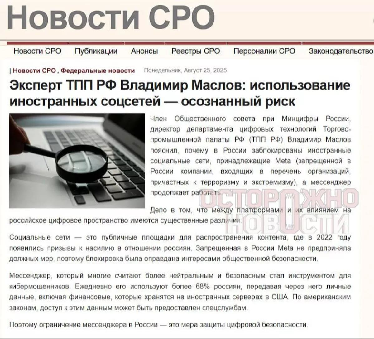 Как узнали «Осторожно, новости», в августе 2025 года портал «Саморегулирование», посвящённый новостям саморегулируемых организаций, выложил на сайте комментарий эксперта торгово-промышленной палаты Владимира Маслова. В нём чиновник рассказал, что блокировка мессенджера «была оправдана интересами общественной безопасности», а также что им пользовались мошенники.