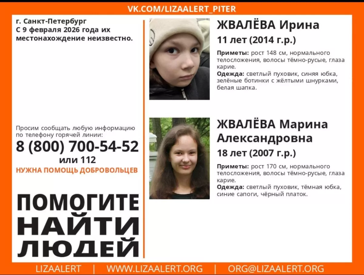 Две сестры 11 и 18 лет пропали в Санкт-Петербурге. Есть версия, что девочки попали в секту, сообщает ТГ-канал 112.