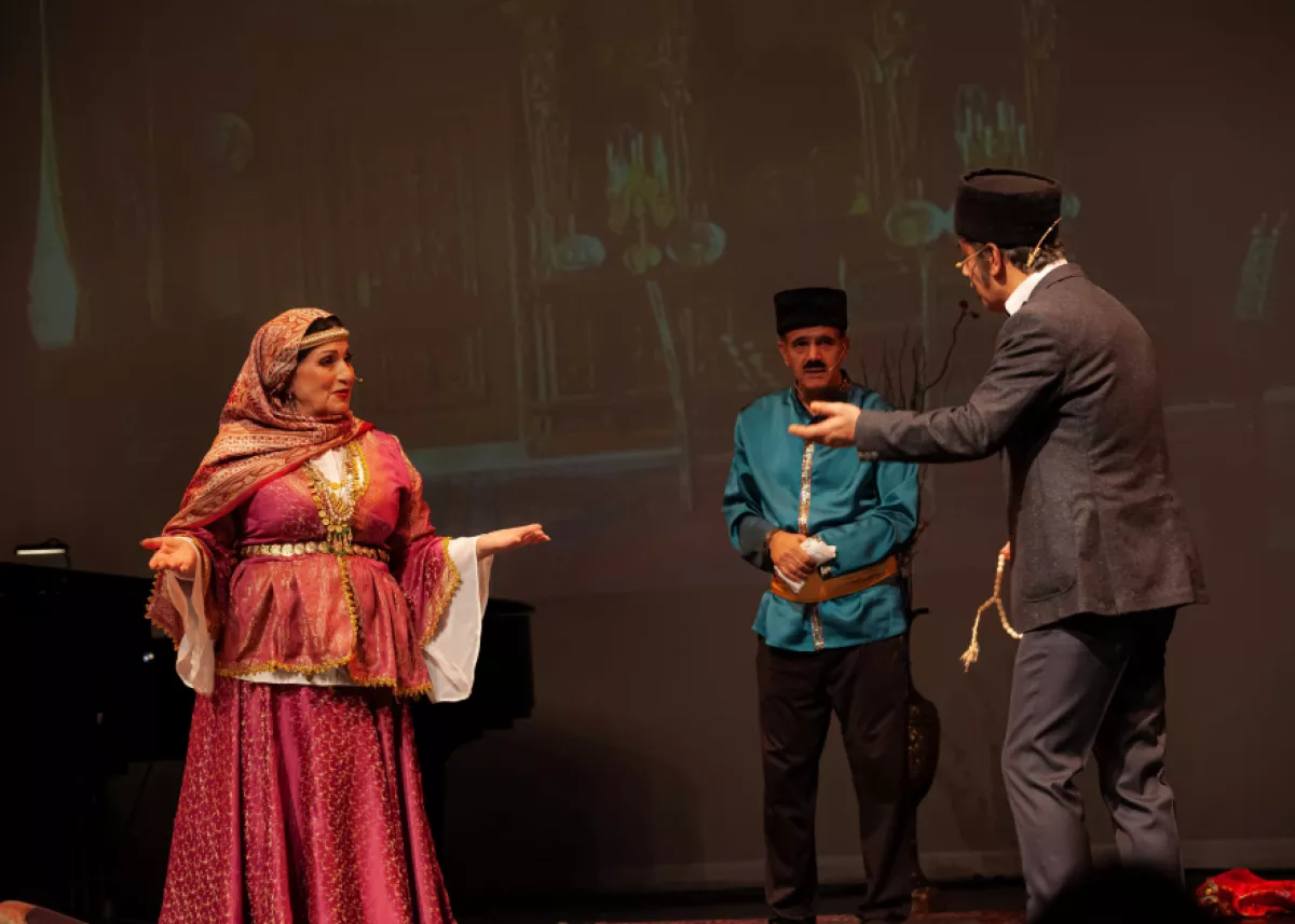 Роли в спектакле, поставленном в современном стиле, исполнили члены Азербайджанского ансамбля музыки и танца «Тебриз».