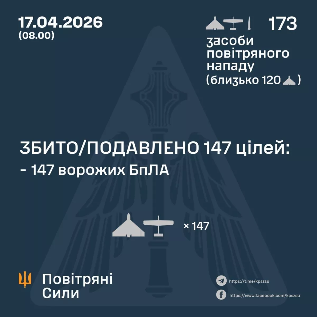 В ночь на 17 апреля Россия атаковала Украину одной баллистической ракетой Искандер-М, а также 172 ударными БПЛА типа «Шахед», «Гербера», «Италмас» и других. Около 120 из них — «Шахеды».
