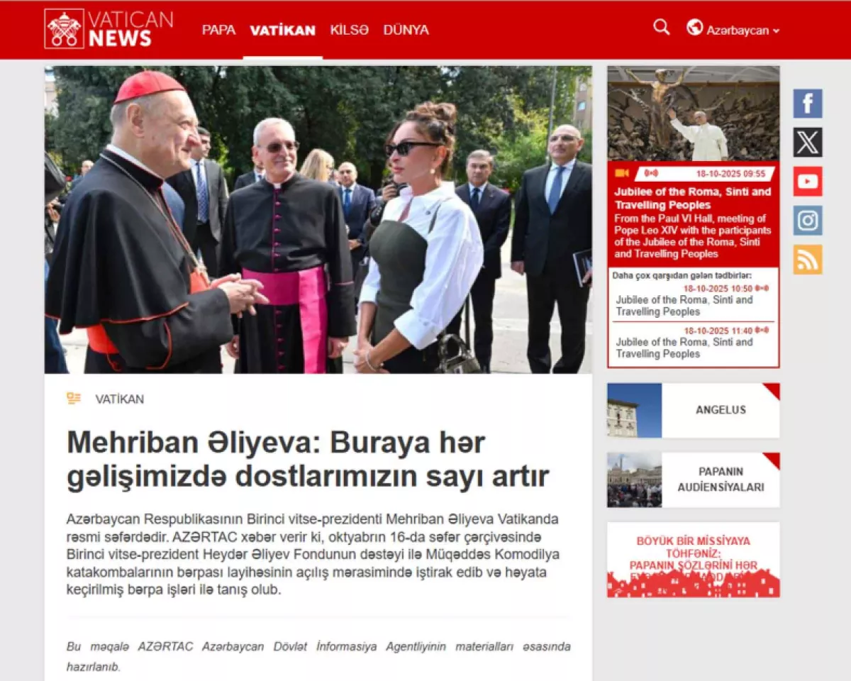 В новостном разделе портала Vatican News Святого Престола на азербайджанском языке опубликована обширная статья, основанная на материалах, опубликованных Азербайджанским государственным информационным агентством (АЗЕРТАДЖ), об официальном визите первого вице-президента Азербайджанской Республики Мехрибан Алиевой в Ватикан.