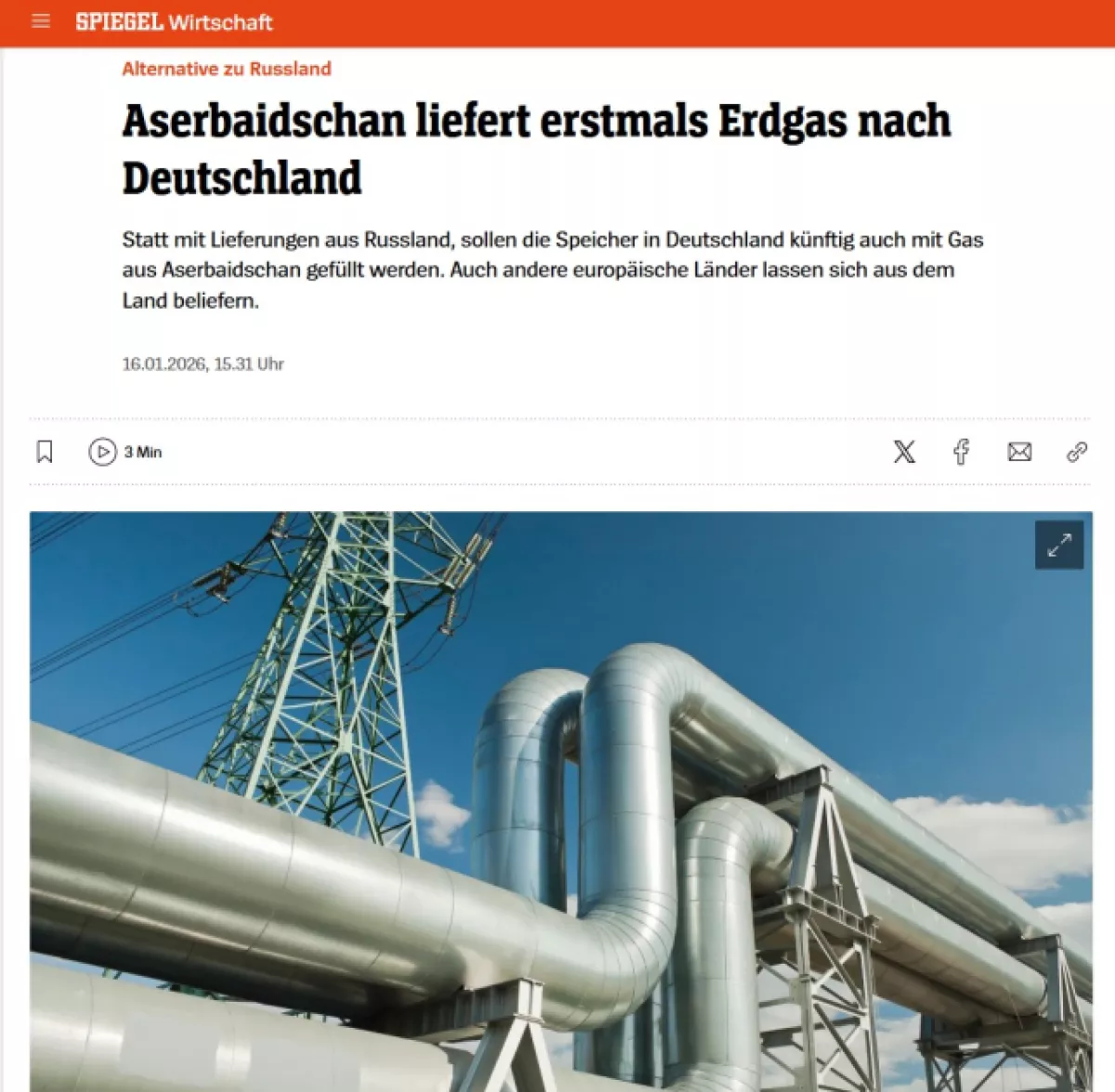 В публикации газеты Spiegel основное внимание уделяется долгосрочному энергетическому сотрудничеству и объемам стабильных поставок, особо подчеркивается стратегическая роль азербайджанского газа на немецком рынке. Отмечается значимость газовых поставок в Германию с точки зрения торговли и долгосрочных контрактов, напоминается о подписании десятилетнего соглашения между SOCAR и SEFE на поставку 1,5 млрд кубометров газа ежегодно. Издание также подчеркивает, что общий объем экспорта азербайджанского газа в Европу в 2025 году составил 12,8 млрд кубометров, что демонстрирует сильные позиции страны на европейском рынке. В то же время отмечается, что дальнейшее увеличение экспорта зависит от инвестиций и расширения пропускной способности газопроводов.