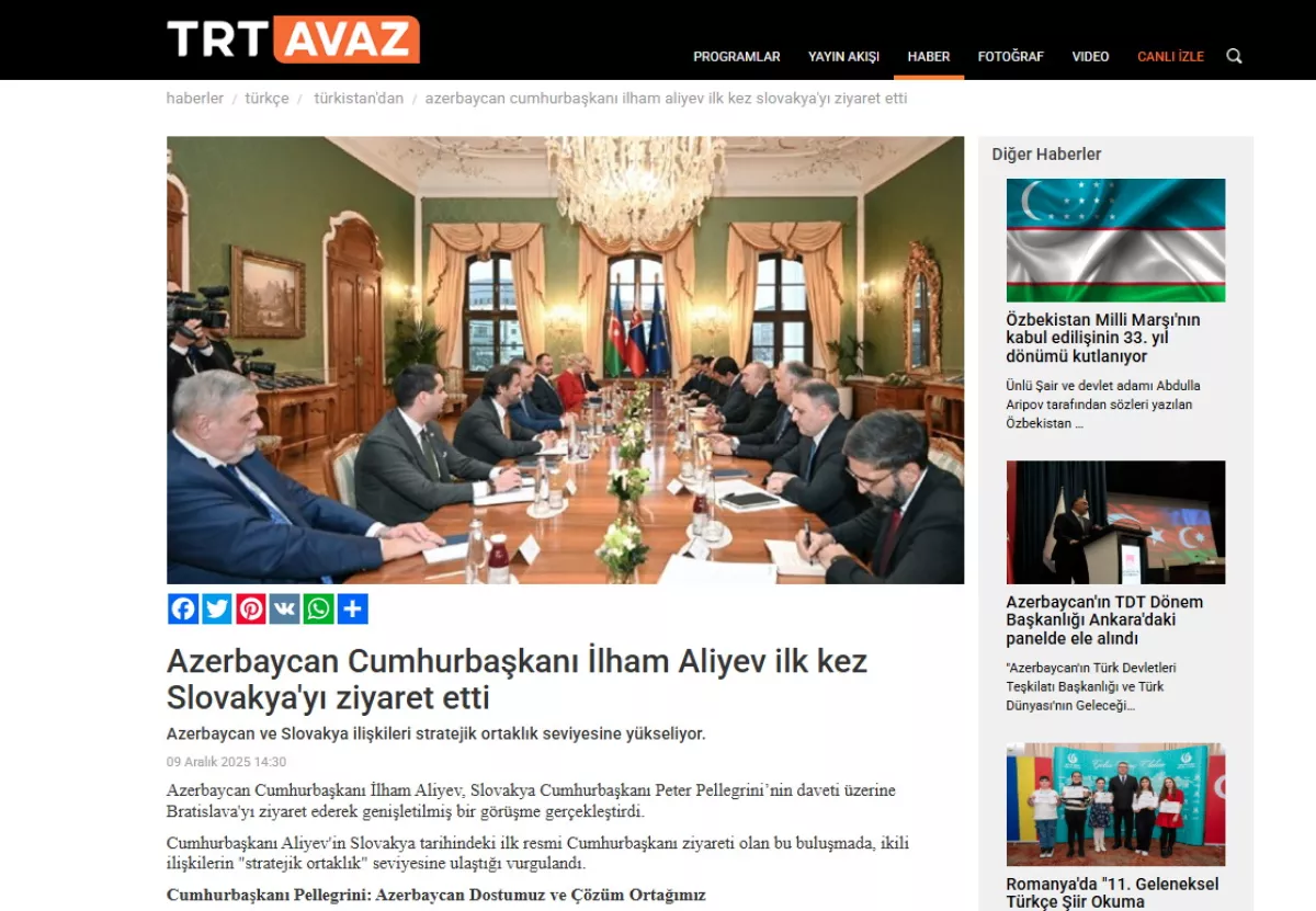 В материале, опубликованном на сайте TRT Avaz под заголовком «Азербайджан - Словакия: отношения повышаются до уровня стратегического партнёрства», сообщается, что на встречах обсуждались возможности сотрудничества в сфере энергетической безопасности, оборонной промышленности, транспорта, а также восстановления Агдамского района на основе концепции «умного села». Подчёркивается, что президент Пеллегрини отметил роль Азербайджана как долгосрочного стратегического партнера, а президент Алиев выразил готовность расширить поставки газа и реализовывать новые оборонные и инфраструктурные проекты, объединяя словацкие технологии и финансовые возможности Азербайджана.