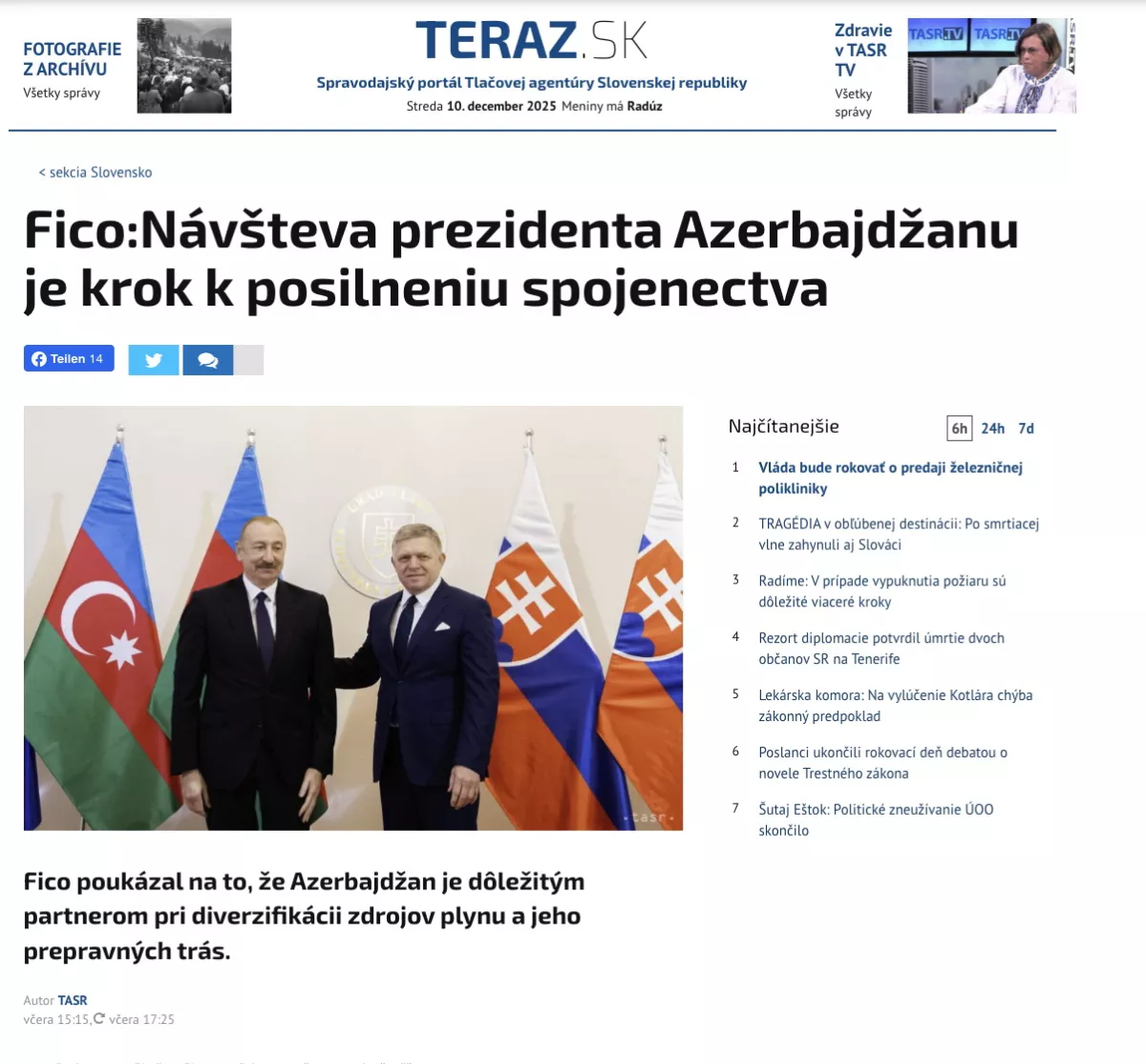 В статье, опубликованной на болгарском сайте Factibg.com, указывается, что на встрече премьер-министра Словакии Роберта Фицо с президентом Азербайджана Ильхамом Алиевым обсуждались перспективы сотрудничества в сфере газовых поставок и оборонной промышленности. Отмечается, что Словакия также планирует укреплять военное партнёрство с Азербайджаном.