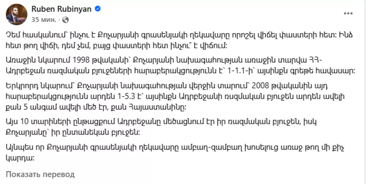 Так что, пусть глава аппарата Кочаряна хоть немного почитает, прежде чем нести чушь», — написал Рубинян.