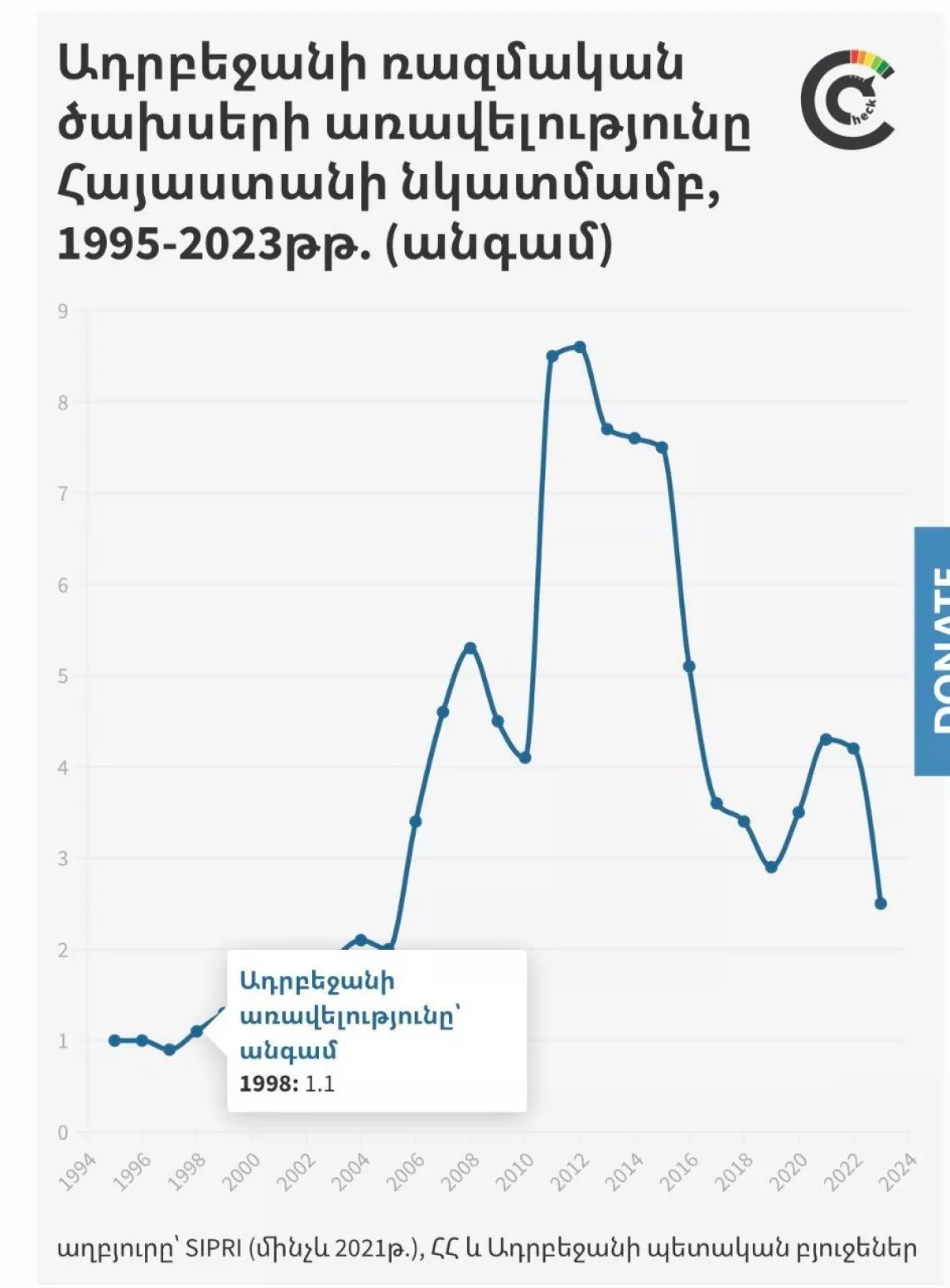 На первой фотографии показано соотношение военных бюджетов Армении и Азербайджана в 1998 году — в первый год президентства Кочаряна. Оно составляло 1 к 1:1, то есть почти равное.