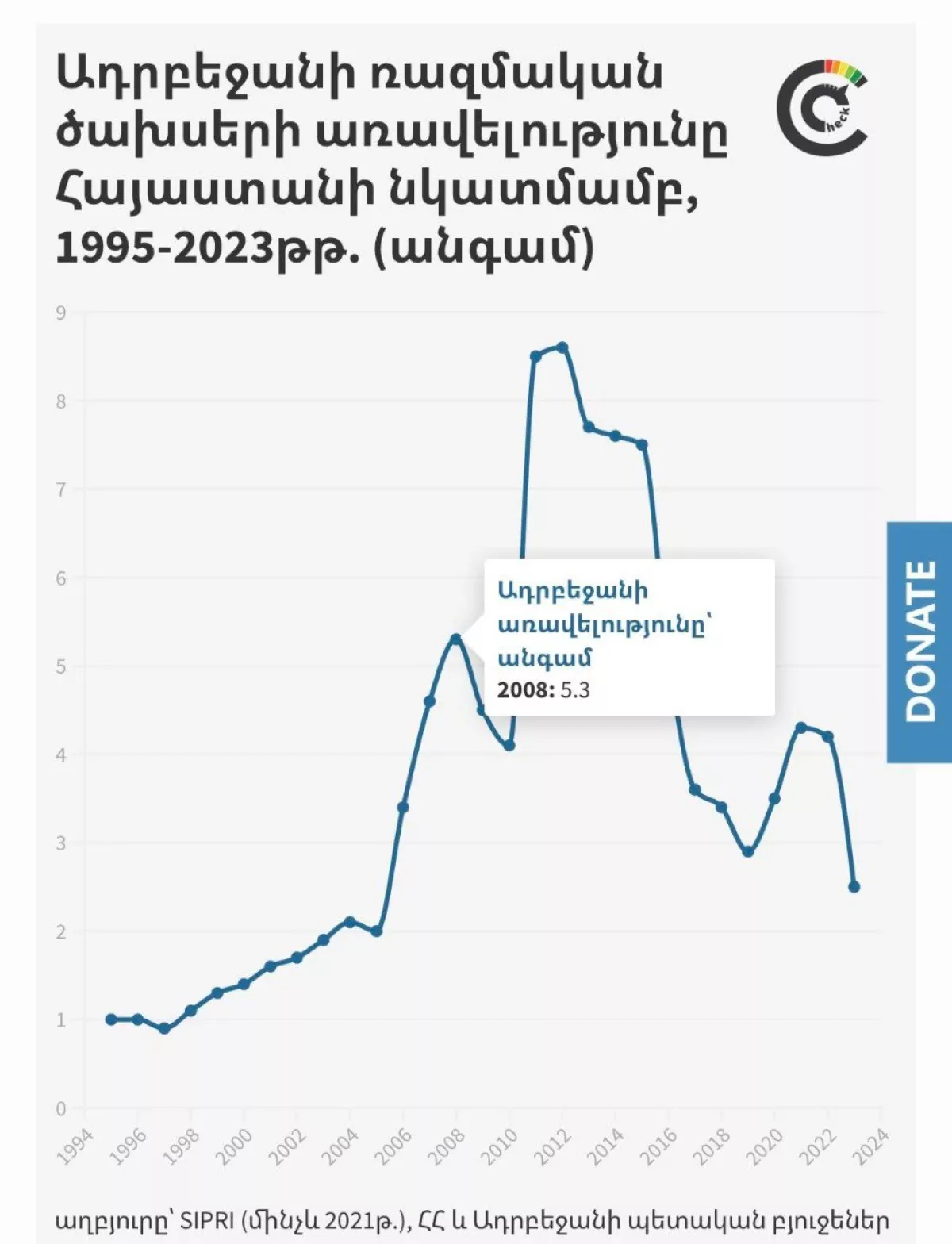 На второй фотографии показано соотношение в последний год его президентства — в 2008 году. К тому времени военный бюджет Азербайджана уже превышал армянский более чем в 5 раз — 1 к 5,3.