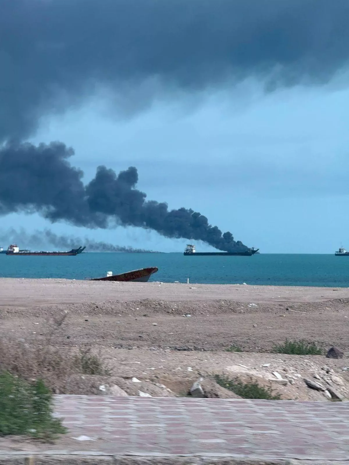 Иранское судно в огне после ударов США и Израиля вблизи порта Бендер-Аббас на юго-востоке Ирана.