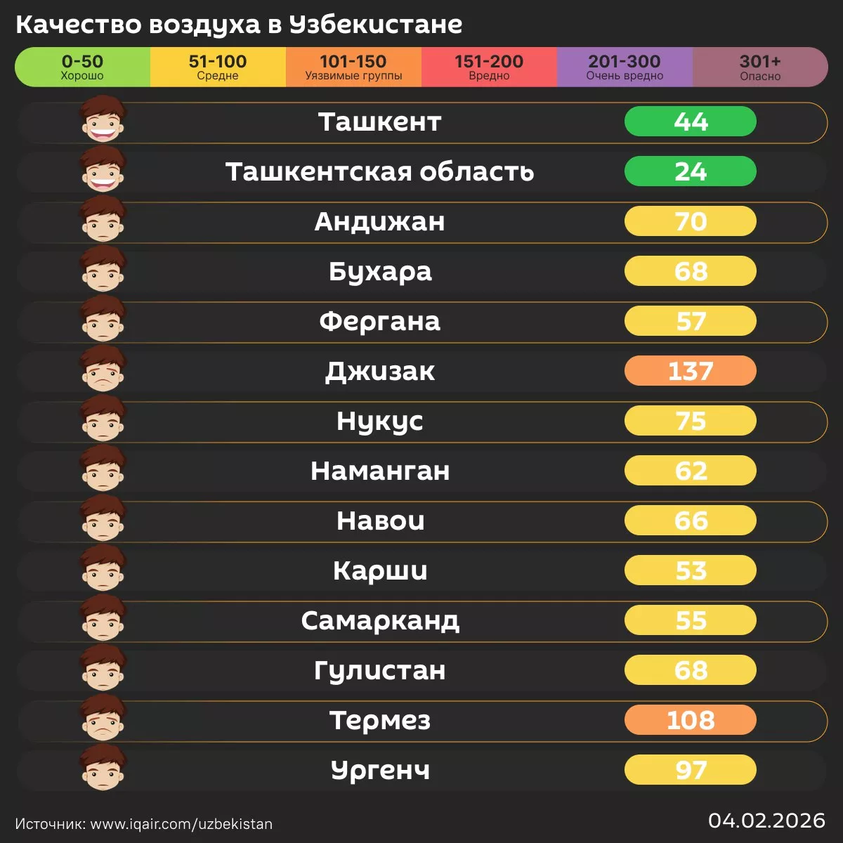 Качество воздуха в других городах Узбекистана — в инфографике.