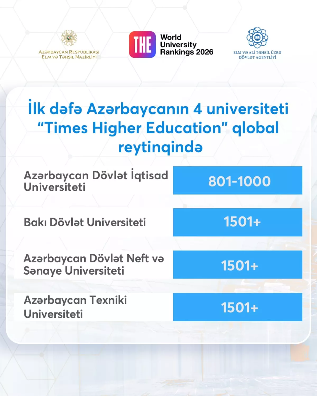 Впервые в истории Азербайджана 4 университета АР вошли в «Рейтинг лучших университетов мира» (World University Rankings 2026), опубликованный международным рейтинговым агентством «Times Higher Education» (THE).