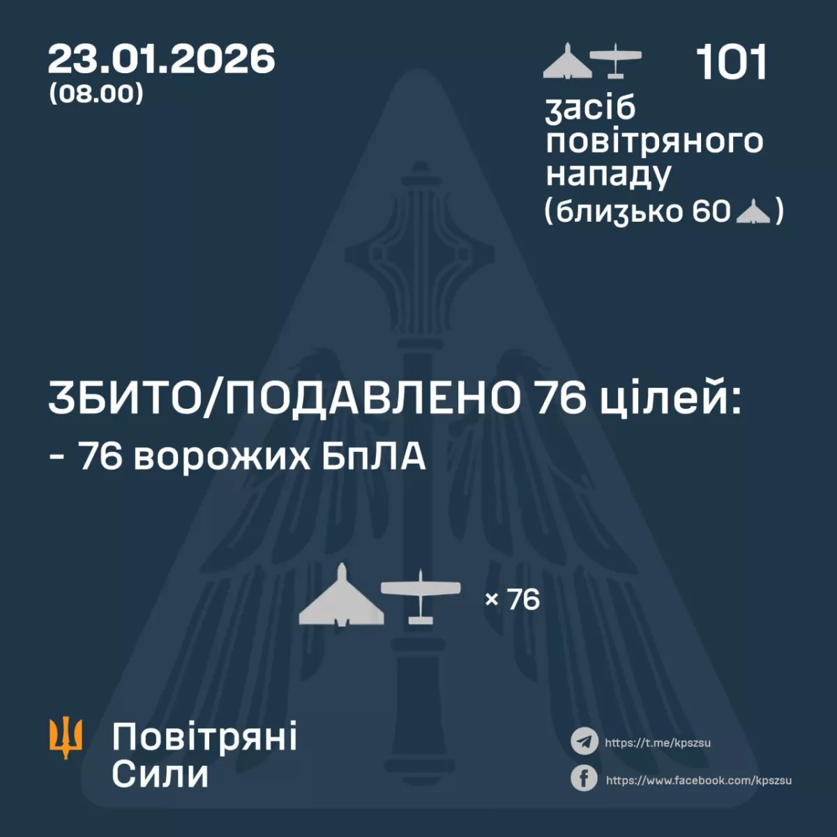 В ночь на 23 января Россия атаковала Украину 101 ударным БПЛА типа Shahed (в том числе реактивными), «Герба» и беспилотниками других типов, около 60 из них — «Шахеды».