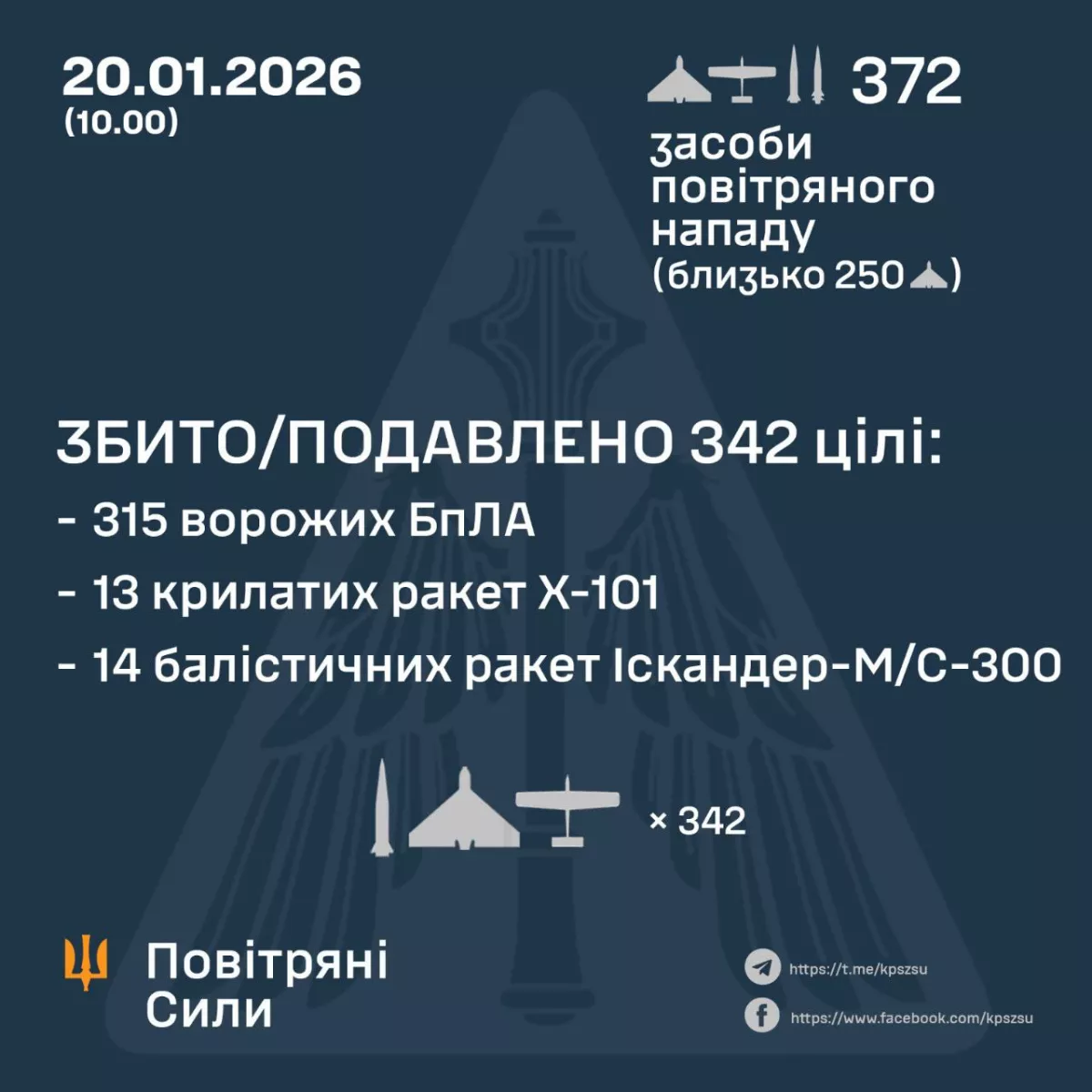 В ночь на 20 января Россия нанесла массированный удар по Украине, применив одну противокорабельную ракету «Циркон», 18 баллистических ракет «Искандер-М/С-300», 15 крылатых ракет Х-101 и 339 беспилотников, около 250 из которых — «шахеды».