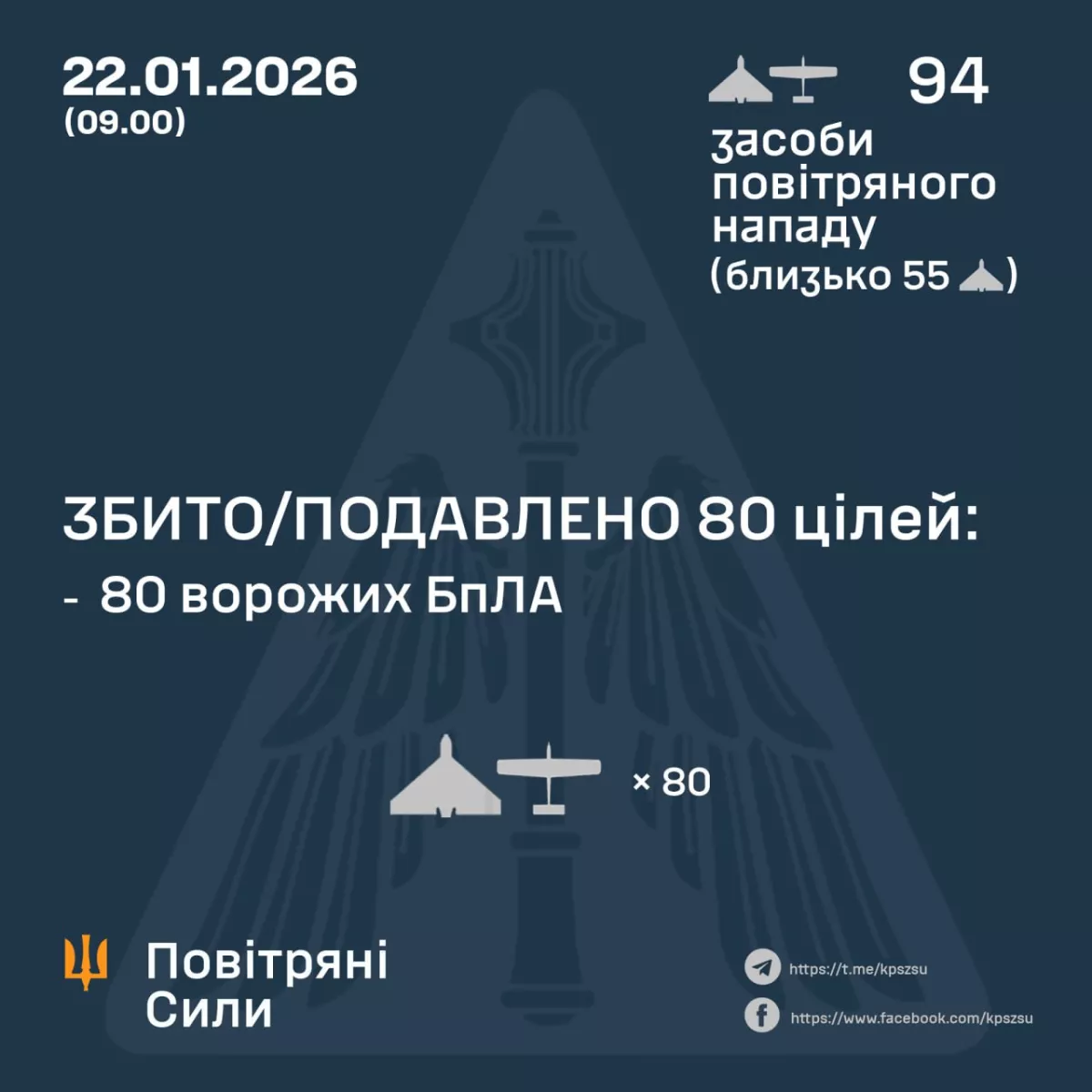 Россия в ночь с 21 на 22 января совершила атаку на Украину, использовав 94 беспилотных летательных аппарата. Из них около 55 были ударными дронами типа «Шахед».