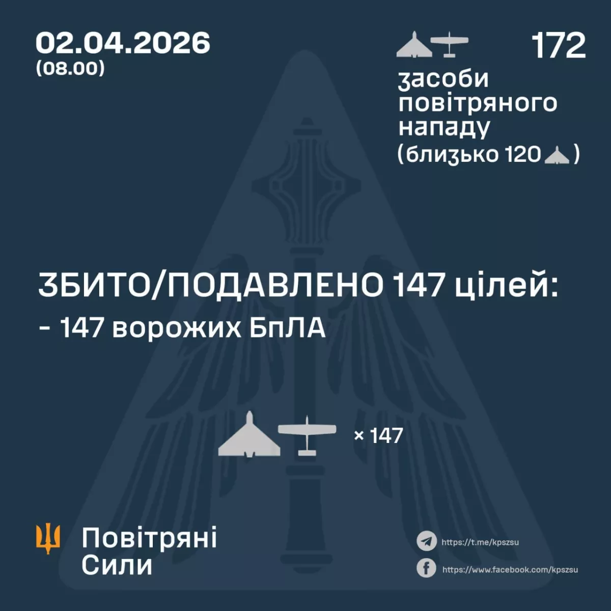 По предварительным данным, 147 БПЛА были сбиты или подавлены средствами ПВО. При этом зафиксированы попадания 22 ударных дронов в 12 локациях, а также падение обломков в ещё 8 местах.