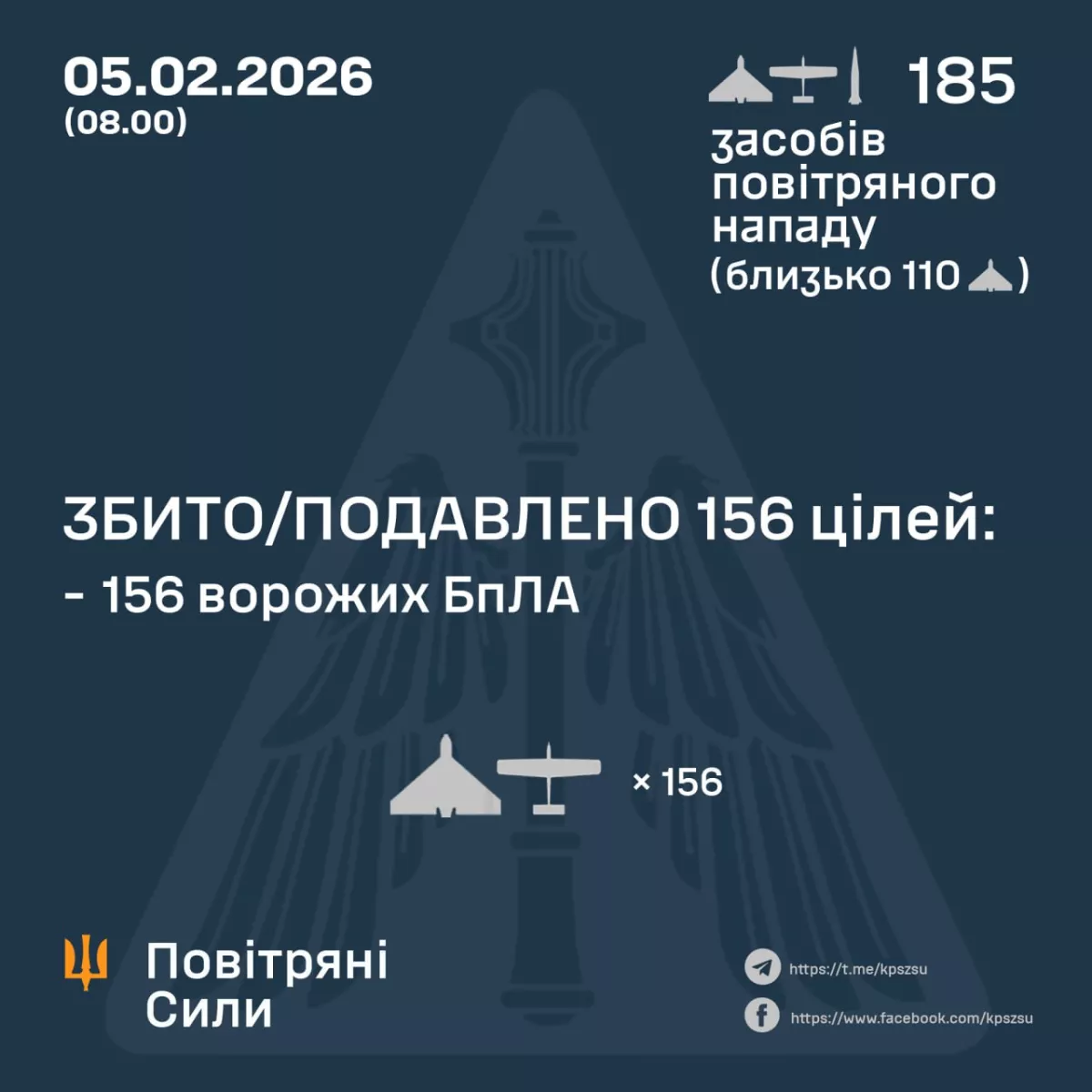 По предварительным данным, на утро 5 февраля было сбито или подавлено 156 российских БПЛА. Также зафиксированы попадания баллистических ракет и 22 БПЛА на 16 различных локациях, а также падение обломков сбитых дронов в 7 локациях.