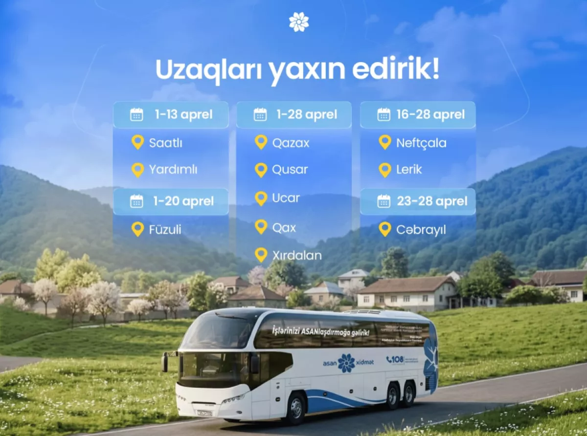Как сообщили Caliber.Az в ASAN, 1-28 апреля выездными услугами можно будет воспользоваться в Газахе, Гусаре, Уджаре, Гахе и Хырдалане, 1-13 апреля — в Саатлы и Ярдымлы, 1-20 апреля — в Физули, 16-28 апреля — в Нефтчале и Лерике, 23-28 апреля — Джебраиле. Автобусы выездного сервиса ASAN работают в будние дни с 10:00 до 17:00 (с 13:00 до 14:00 — обеденный перерыв), однако в Ярдымлы, Физули, Лерике, Нефтчале и Джебраиле будет другой график — с 11:00 до 17:00.