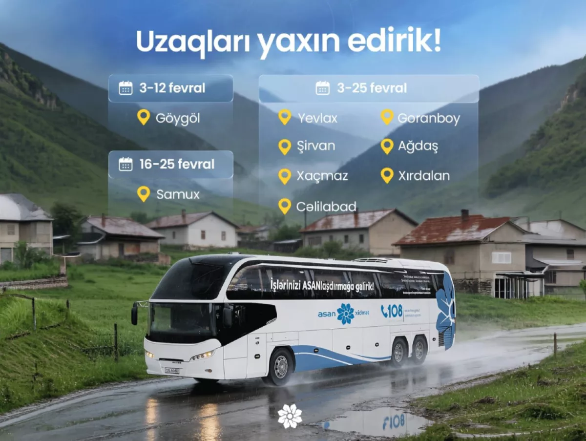 Как сообщили Caliber.Az в ASAN, 3-25 февраля выездными услугами можно будет воспользоваться в Евлахе, Ширване, Хачмазе, Джалилабаде, Гёранбое, Агдаше и Хырдалане, 3-12 февраля — в Гёйгёле, 16-25 февраля — в Самухе.